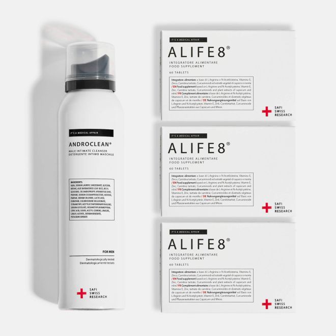 Alife8® è un integratore alimentare a base di N-acetilcisteina, Carnitina tartrato, vitamina E, L-arginina, Zinco, Curcuminoidi, Mentolo e Capsaicina, utile per integrare tali nutrienti in caso di aumentato fabbisogno. Lo Zinco contribuisce alla normale fertilità e alla fisiologica produzione di testosterone.