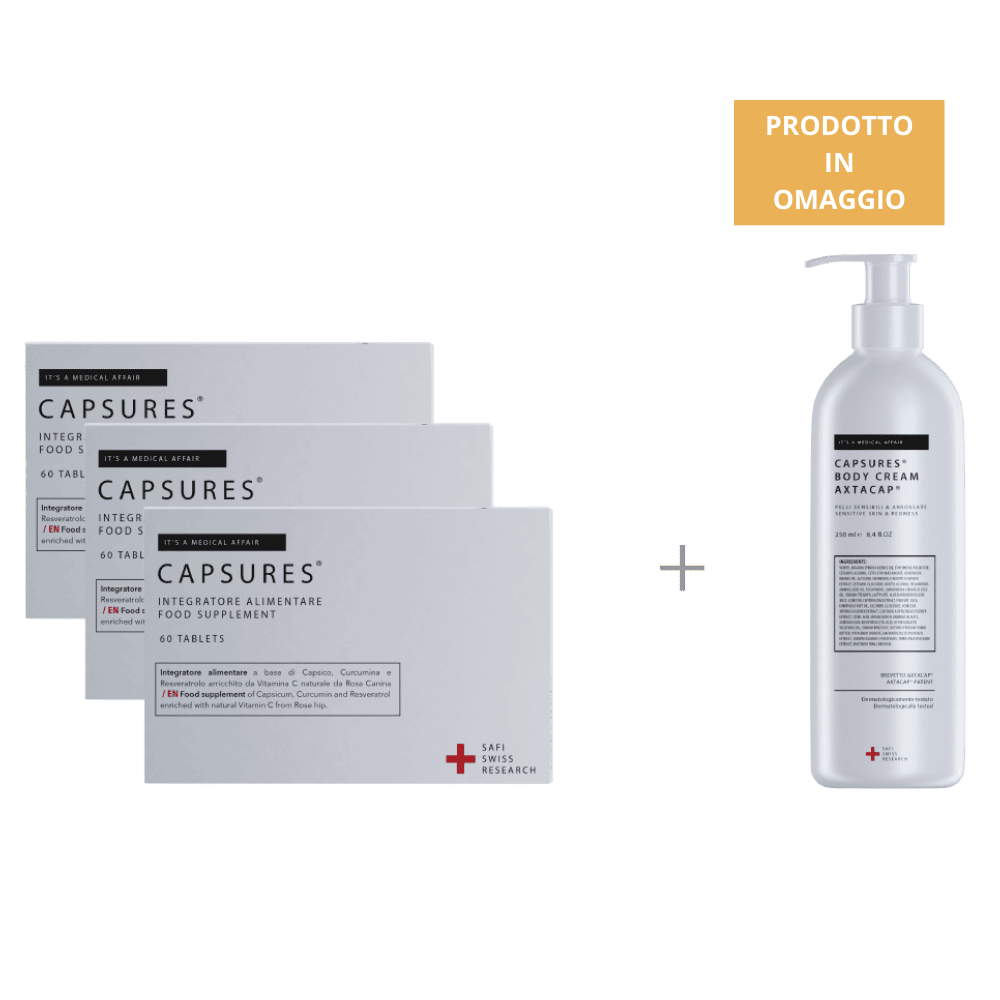CAPSURES® offre un supporto mirato contro lo stress ossidativo, contribuendo a contrastare la diffusione dei radicali liberi. Grazie alla presenza di Vitamina C da Rosa Canina, favorisce la formazione fisiologica del collagene, essenziale per la normale funzione cutanea.